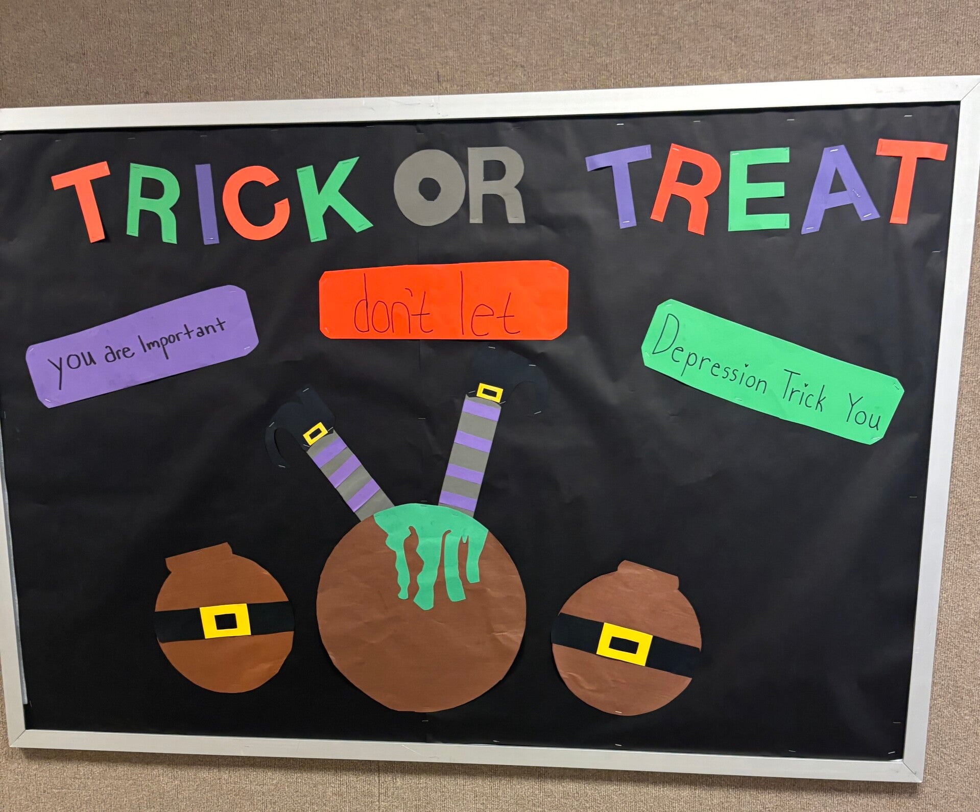 Our "Trick or Treat" bulletin board was based on the idea of depression and its effect. our goal was to raise awareness about depression.