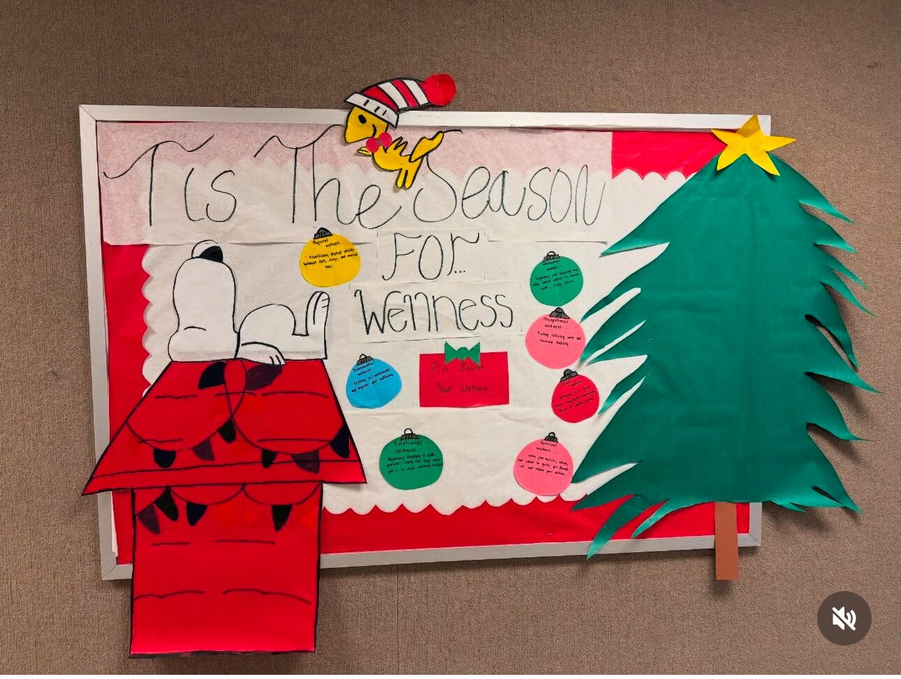 Our Holiday themed bulletin board was an attempt to highlight the different organization of wellness for example: physical, intellectual, and social.