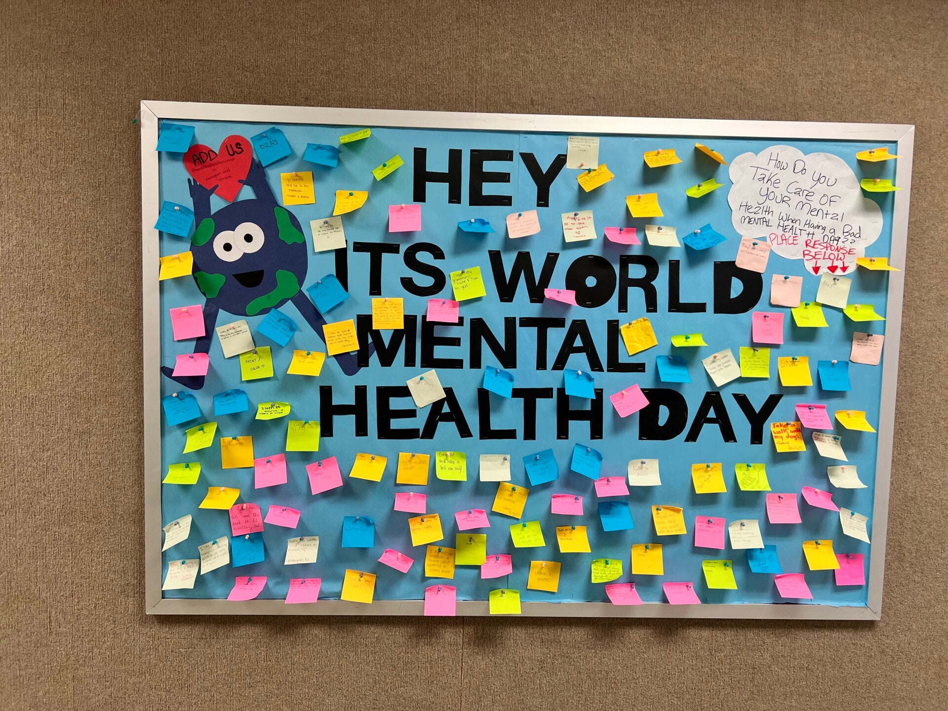 In honor of World Mental Health Day we went around Killeen Career Center and informed students about the national day and what it's meaning is, afterwards we then allowed them to write down positive things they do for their mental health.